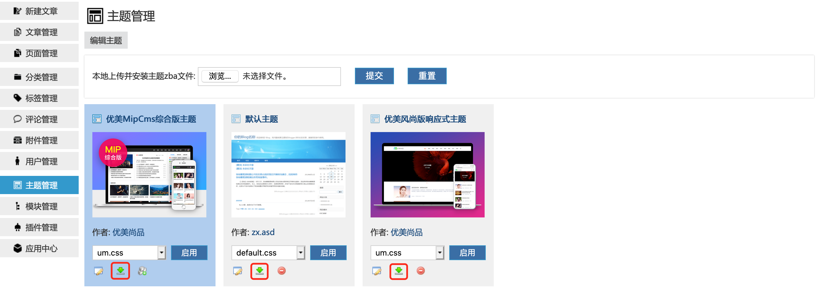 开启之后点击底部提交按钮,回到主题管理菜单,这时候我们就可以看到下载导出的按钮,如图: