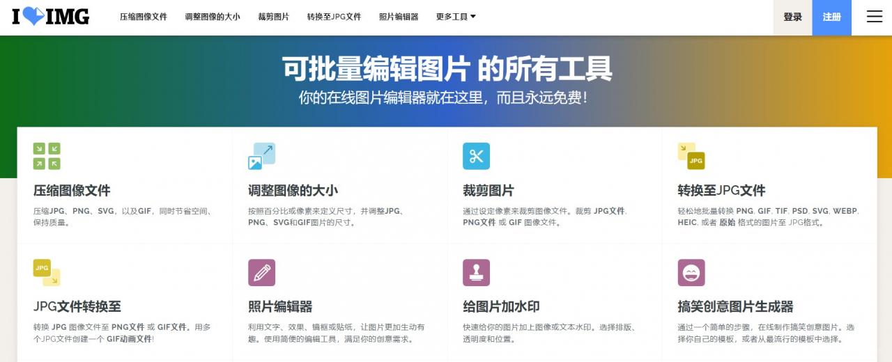 iLoveIMG 可帮助你以最佳质量和压缩率压缩 JPG、PNG 或 GIF等格式的图片,同时它还可以调整图片尺寸、裁剪、转换图片格式,另外它还能为图片添加水印,所有功能可以免费使用,而且不需要注册登录,使用起来非常便捷。